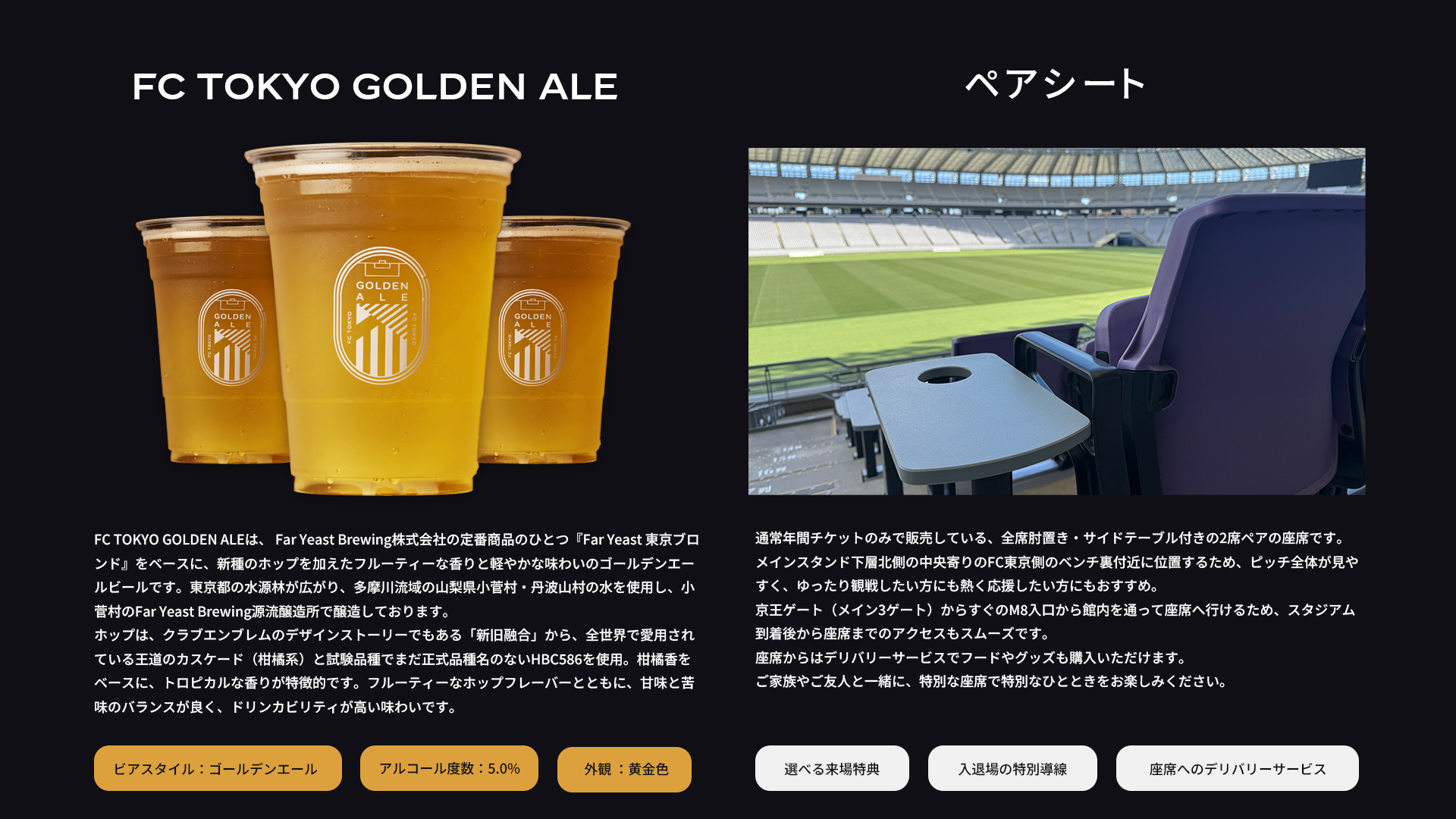 ※『FC TOKYO GOLDEN ALE』는 좌석에서 이용 가능한 푸드 딜리버리 서비스를 통해 제공됩니다.