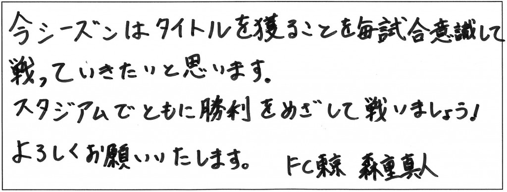 昨日、昨年SOCIOで2013シーズンのお申込みがされていないみなさまに、改めて継続のお願いの郵便をお送りさせて頂きました。郵送物を送るにあたって、今シーズンのゲームキャプテンとなった森重選手に、メッセージを書いてもらいました。