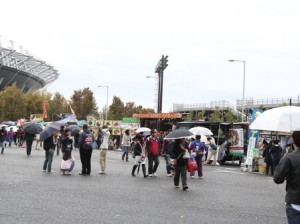 このイベントの醍醐味は試合終了後にあると自分では思っているのですが、天候に恵まれて試合終了後も開催できたのは2011シーズンの初回時のみで、3回開催した2012シーズンでは、1回目は春の嵐に見舞われてテントやのぼりが飛びそうになったり、ソーセージが地面を転がったり、2回目は晴れ過ぎてしまい猛暑となり人出があまり多くなく、3回目は秋の冷たい雨と寒さに耐えながらという状況に。