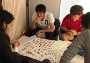 3月から選手会長の廣永選手、副会長の米本選手が中心となってグッズ制作会社と打合せを重ねてきました。今回は全選手の似顔絵イラストを使用することとなったので、各選手が自分の似顔絵をチェックしています。一発OKを出す選手、「ちょっとここを直してください・・・」「この選手のこの部分が似ていないから、もうちょっと直したら?」などなど、自己申告、周囲のチェックが入って、最終的には全員が納得のイラストとなりました。