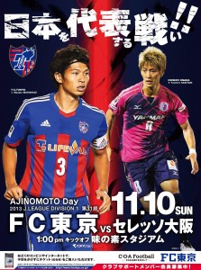 2013年11月10日。どうすれば味スタに40,000人を集められるのかをとにかく毎日考えて、「速(スピード)割」チケットや「味スタは○○○が埋める!!!」などのプロモーションを実施しました。その試合の告知ポスターには森重選手と、対戦相手である柿谷選手を配し、さらに「日本を代表する戦い!!」のひらがな部分を小さくすることで一瞬「日本代表戦」に見間違えるようなキャッチコピーまでつくったりもして・・・。メディアにもお願いしてたくさん取り上げてもらいました。