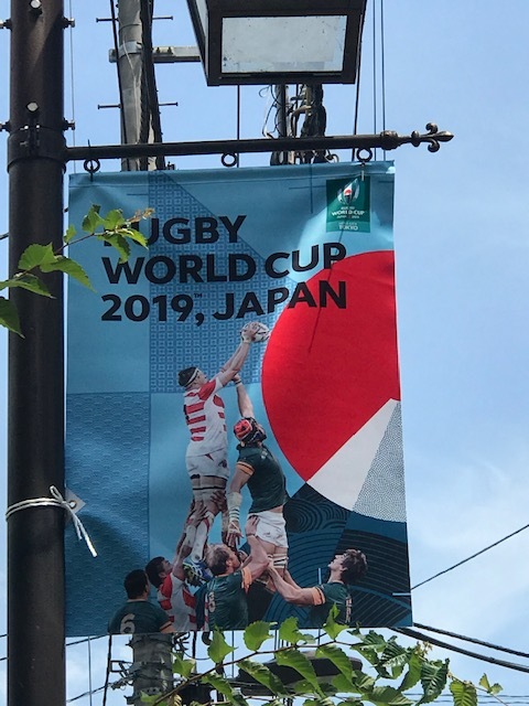 今夏はラグビーW杯が行なわれるため、府中市の街路灯フラッグはラグビー一色に変化しています。