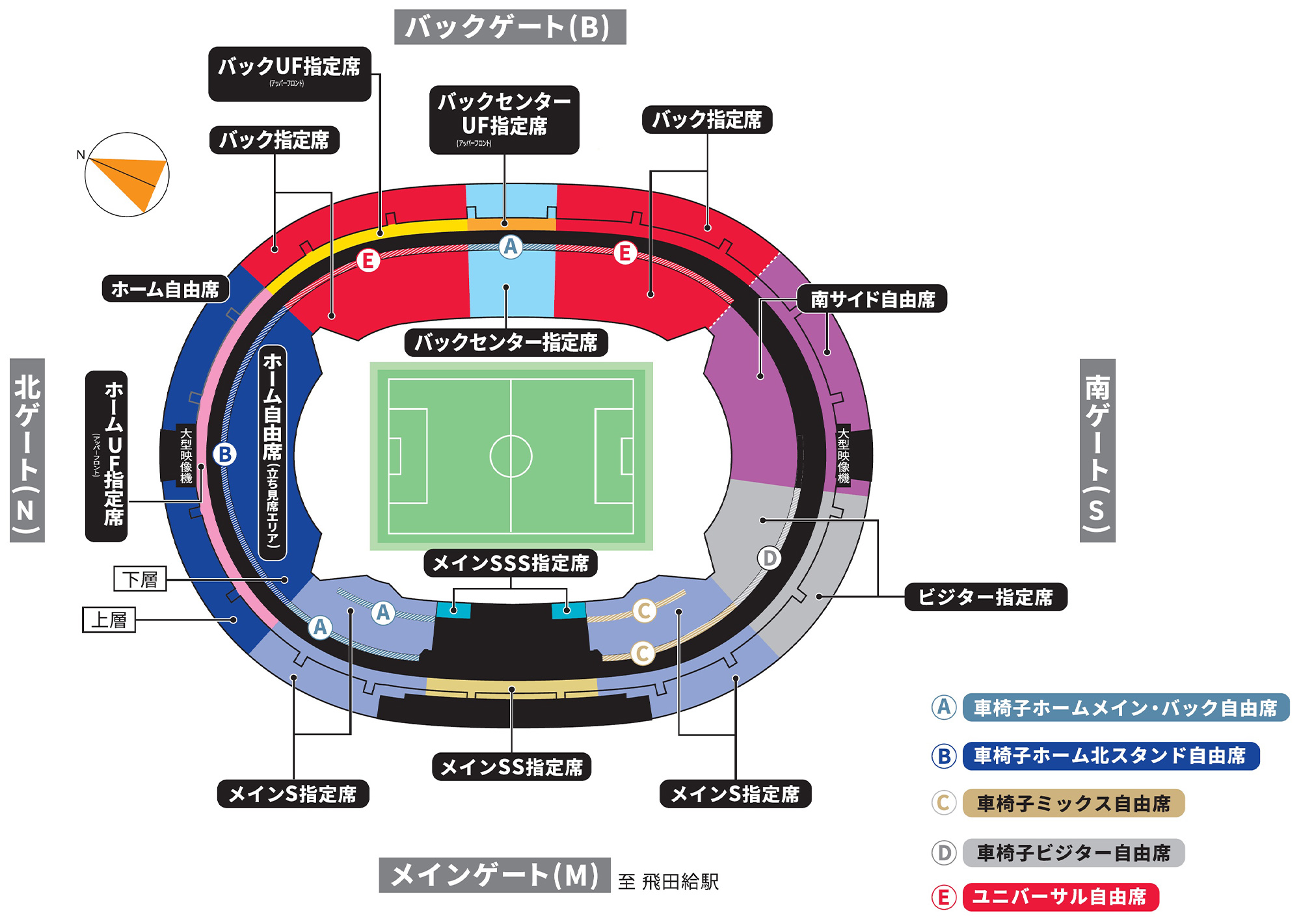 서 있는 사람에게 '앉아 주세요'라고 말하지 않는 구역입니다. - 비지터 굿즈를 착용하고 비지터 팀을 응원할 수 있는 좌석은 「메인 SS 지정석 남쪽」, 「메인 S 지정석 남쪽」, 「비지터석」이며, 그 외의 좌석은 모두 FC 도쿄 응원석입니다.