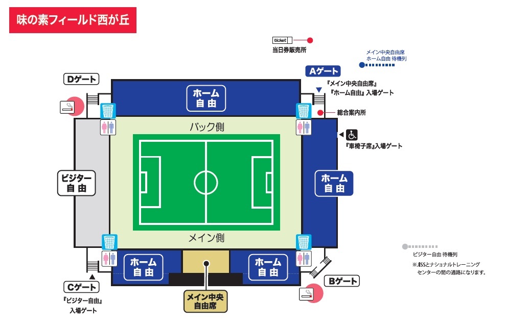 ※この試合に限り、ビジター待機列はJISSとナショナルトレーニングセンターの建物の間の通路になります。15:15頃にCゲート付近へ移動いたします。