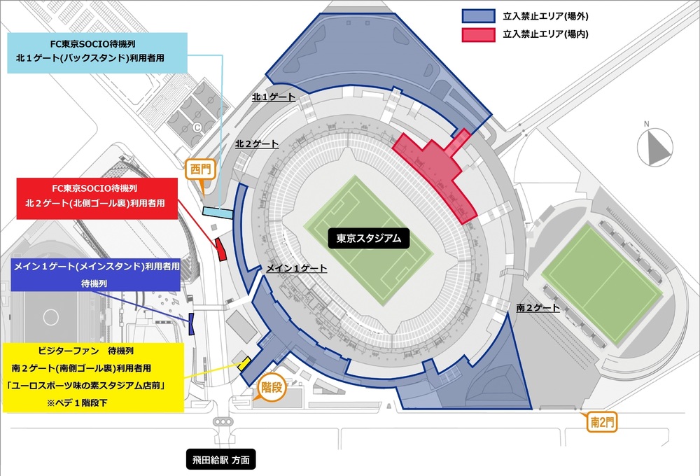 ・試合当日、決められた時間にお集まりいただき、準備ができ次第、味の素スタジアム敷地内の各入場ゲート前(以下、待機列エリア)に移動します。