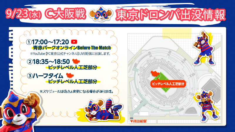 9/23(水) 2020明治安田生命J1リーグ第18節 vsセレッソ大阪(19:00キックオフ/味の素スタジアム)に東京ドロンパが下記の通りあらわれます。お楽しみに!