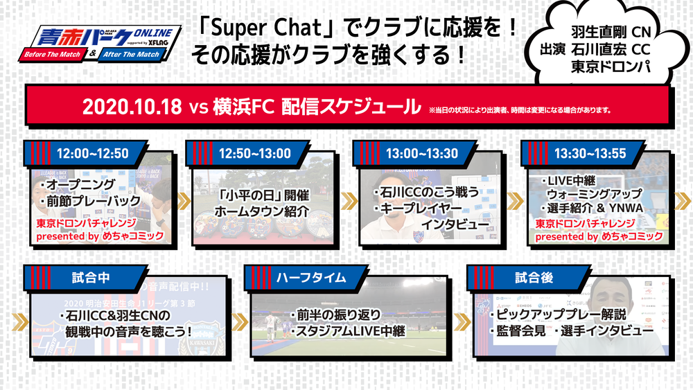 FC東京では、STAY WITH TOKYO施策の一環として、J1リーグ戦の試合前後にYouTube【FC東京公式チャンネル】にてLIVE配信企画『青赤パークオンラインBefore The Match/After The Match supported by XFLAG』を開催しております。