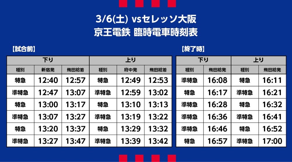 3月6日(土) 2021明治安田生命J1リーグ 第2節 vs セレッソ大阪(14:00キックオフ/味の素スタジアム)にて運行される臨時交通アクセス(鉄道)についてご案内いたします。