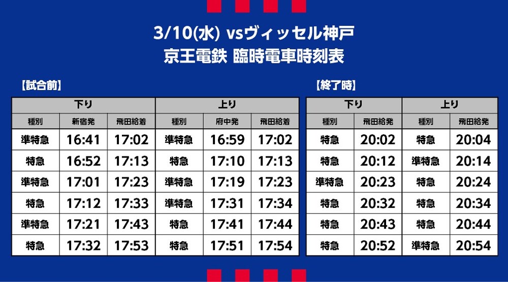 3月10日(水) 2021明治安田生命J1リーグ 第3節 vs ヴィッセル神戸(18:00キックオフ/味の素スタジアム)にて運行される臨時交通アクセス(鉄道)についてご案内いたします。