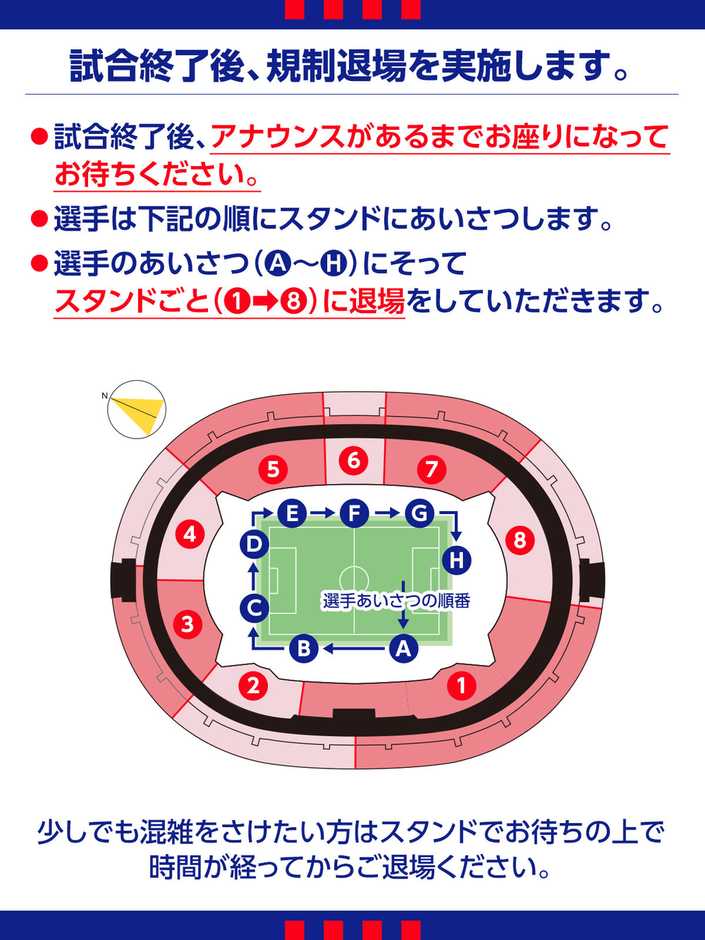 試合終了後、規制退場に移行しますのでアナウンスがあるまでお座りになってお待ちください。