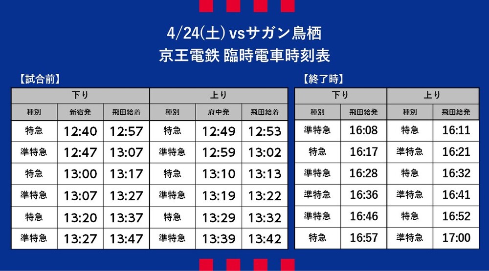 4月24日(土) 2021明治安田生命J1リーグ 第11節 vsサガン鳥栖(14:00キックオフ/味の素スタジアム)にて運行される臨時交通アクセス(鉄道)についてご案内いたします。