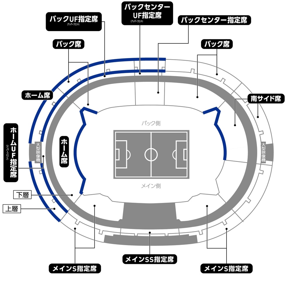 ・バック2ゲート:バックセンターUF指定席、バックセンター指定席、バックUF指定席、バック席、南サイド席