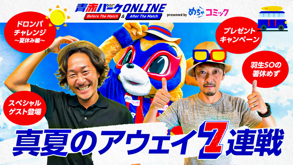 『青赤パークオンラインBefore/After The Match presented by めちゃコミック』では7月11日(日)からのアウェイ7連戦を、ファン・サポーターの皆さまと盛り上げるべく、『真夏のアウェイ7連戦』としご自宅などからオンラインでFC東京の試合を観戦いただくみなさまに、少しでも長く、最大限楽しんでいただけるよう、様々な企画を実施いたします!