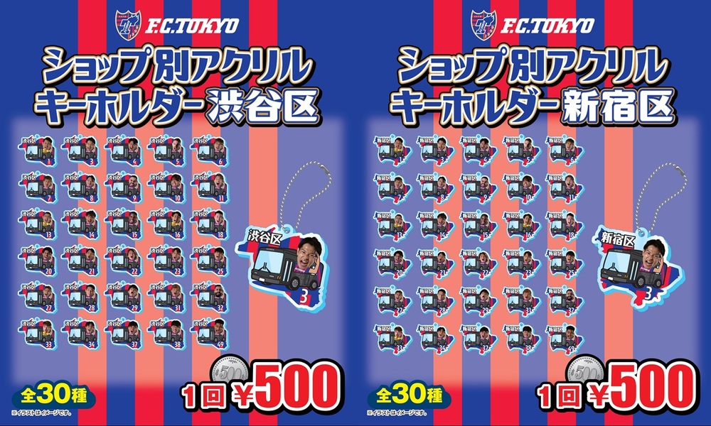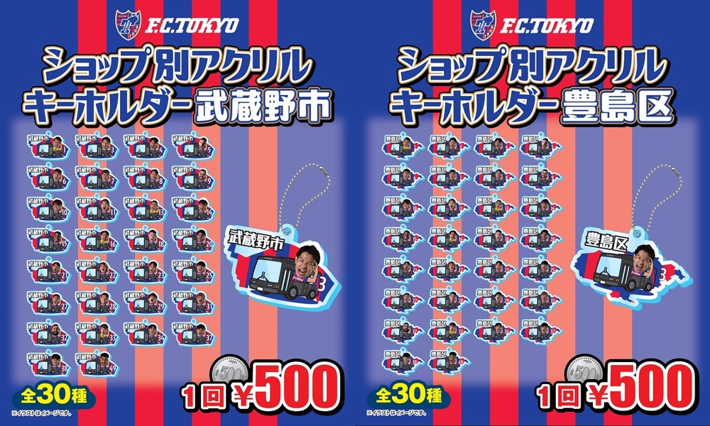 各オフィシャルショップの所在地の市区をモチーフにしたアクリルキーホルダーを販売いたします。