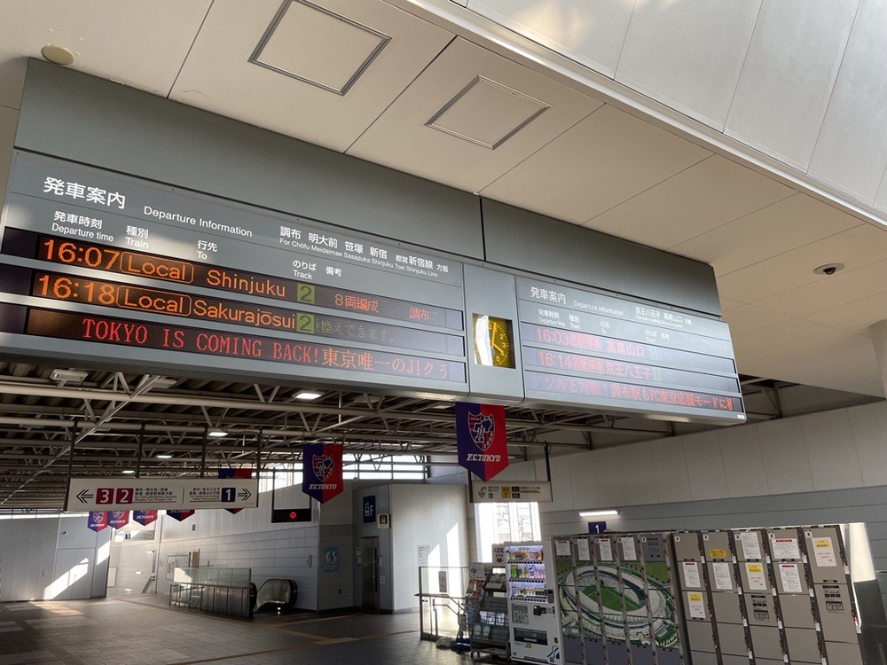 京王電鉄駅電光テロップ(行先案内盤)にアウェイ連戦を終えてホームに帰ってくるFC東京へのメッセージが掲出されます。