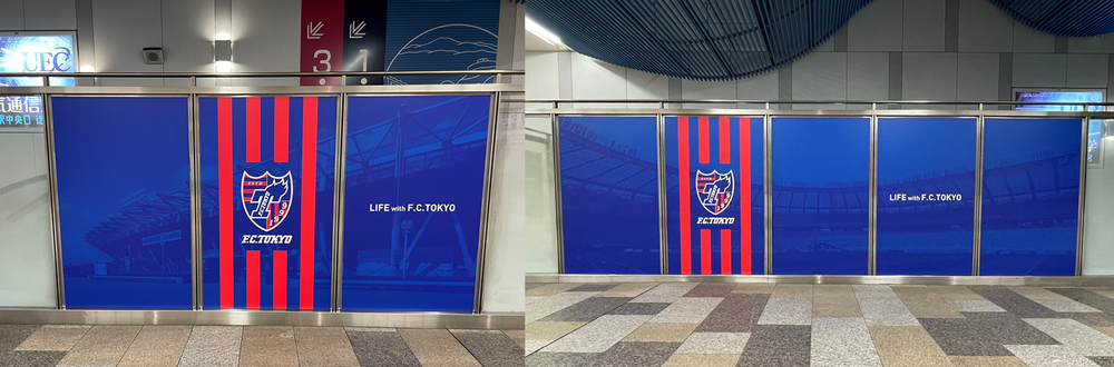 京王電鉄調布駅の構内腰壁ガラスパネルおよび中央口階段がFC東京ビジュアルで装飾されます。