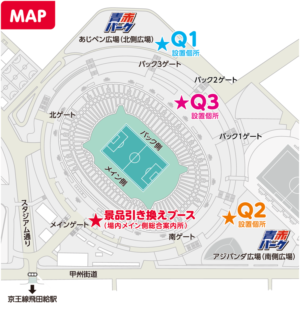 あじペン®広場・アジパンダ広場・場内バック側コンコースの3か所に設置されているFC東京にまつわるクイズに回答いただき、すべてのクイズに回答いただいた方に東京ドロンパオリジナルステッカーをプレゼントいたします。