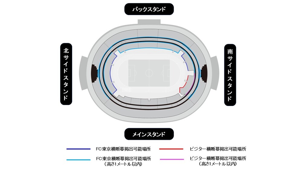 ビジターチームユニフォームおよびグッズを身に着けた方は北サイドスタンド(1~3層目)への通行はできません。またFC東京ユニフォームおよびグッズを身に着けた方は南サイドスタンドビジター指定席エリア(1層目~3層目)への通行はできませんのでご注意ください。