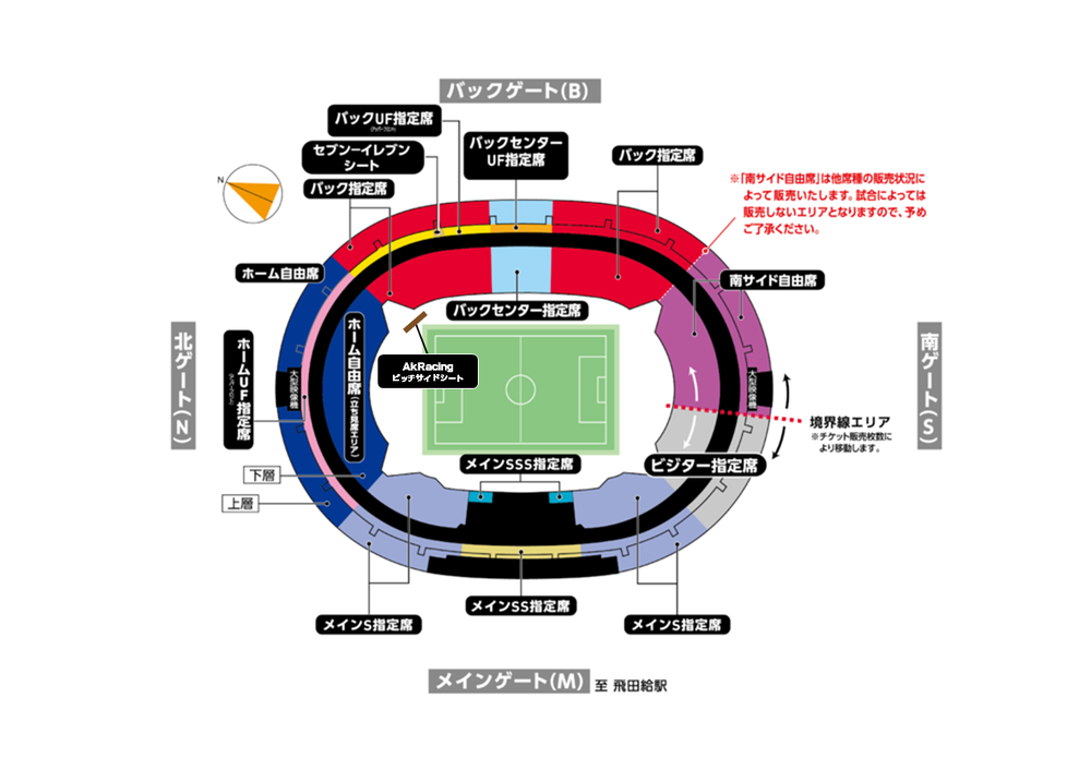 ※ビジターチームのユニフォーム・グッズの着用、およびビジターチームの応援ができる席種は上記の「メインSS指定席 南側」、「メインS指定席 南側」、「ビジター指定席」の3席種となり、それ以外の席種は全てFC東京の応援席となります。