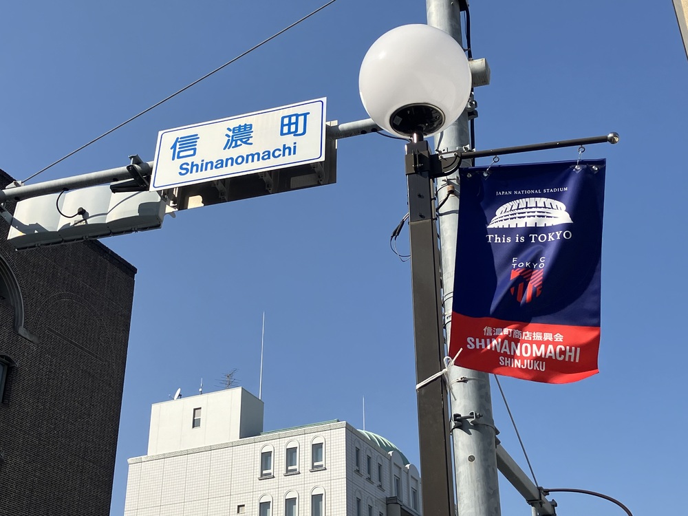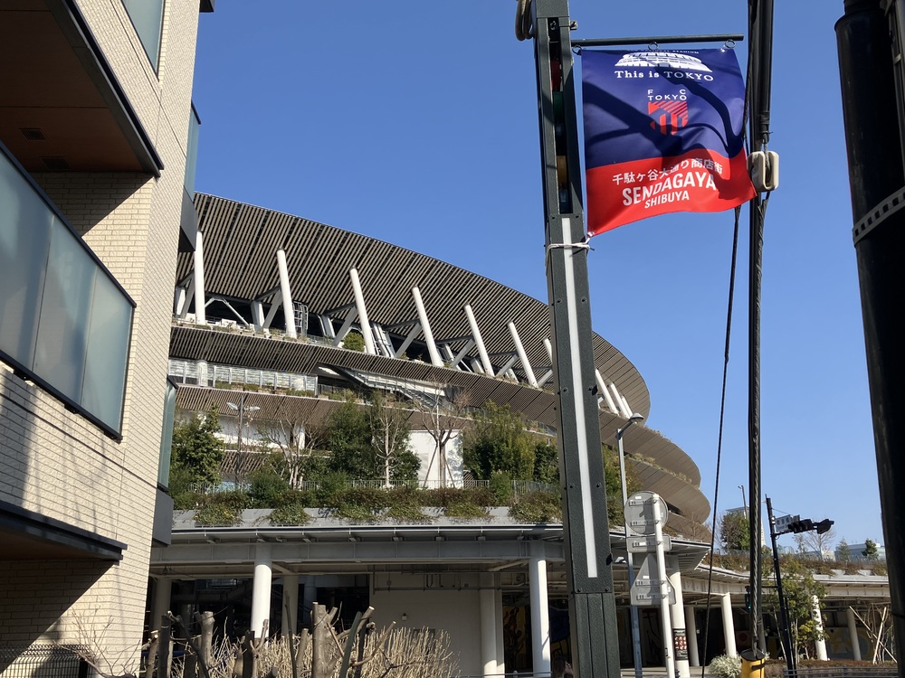 信濃町商店振興会、千駄ヶ谷大通り商店街のご協力により、国立競技場開催限定の街路灯フラッグが掲出されています!