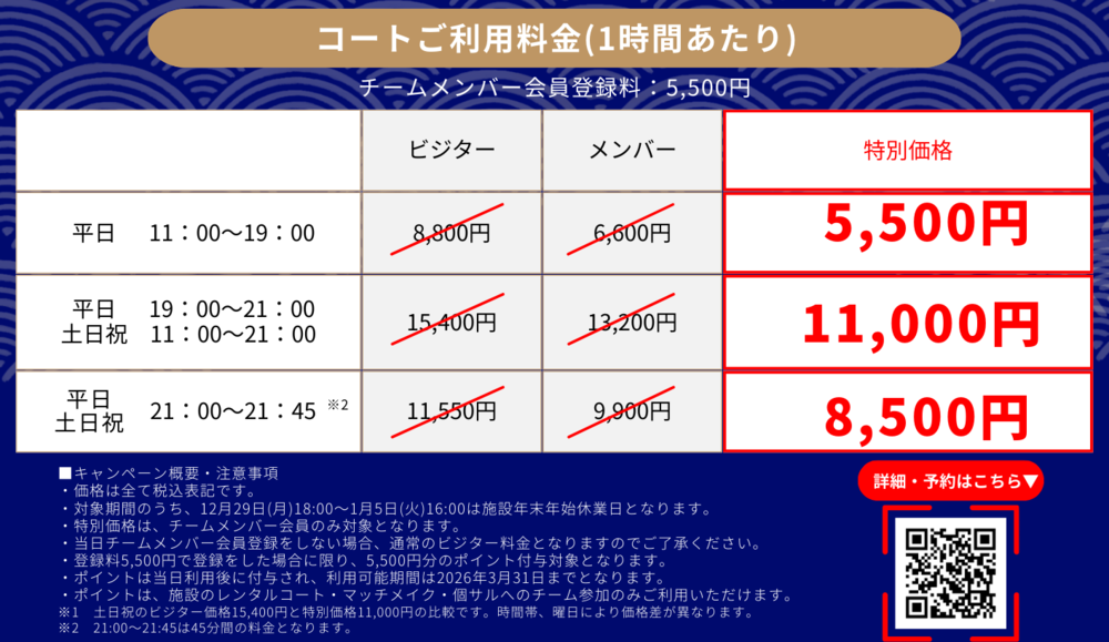 いつもの仲間とのご利用はもちろん、施設のご利用が初めてのビジターさんも、年末も、年始も“まるっと”おトクにレンタルコートをご利用いただけます。
