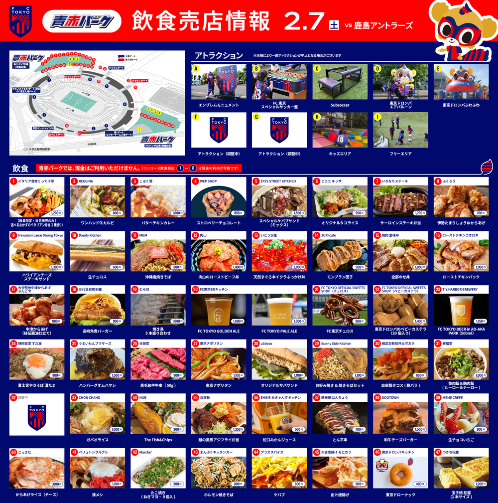 2月7日(土)明治安田J1百年構想リーグ第1節 vs 鹿島アントラーズ(13:30キックオフ/味の素スタジアム)の、青赤パーク(場外)、出張!! 青赤パーク、スタジアム内コンコース(場内)売店にて販売する飲食情報をお知らせします。
