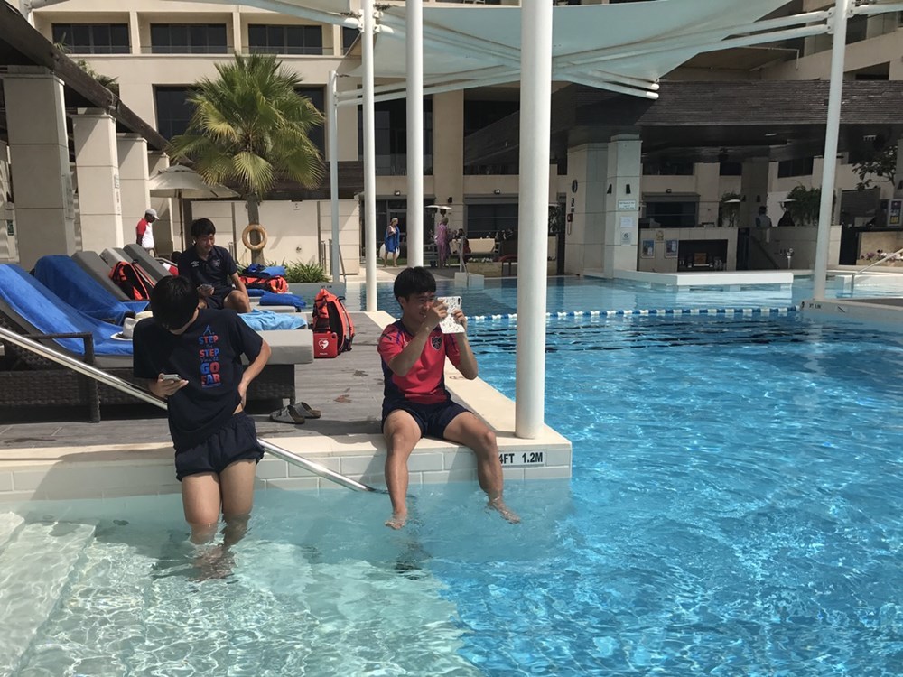 練習後には、気温が高い環境で身体が火照っているため、ホテルにあるプールでクールダウン。選手たちは様々な工夫をして疲労感をとります!