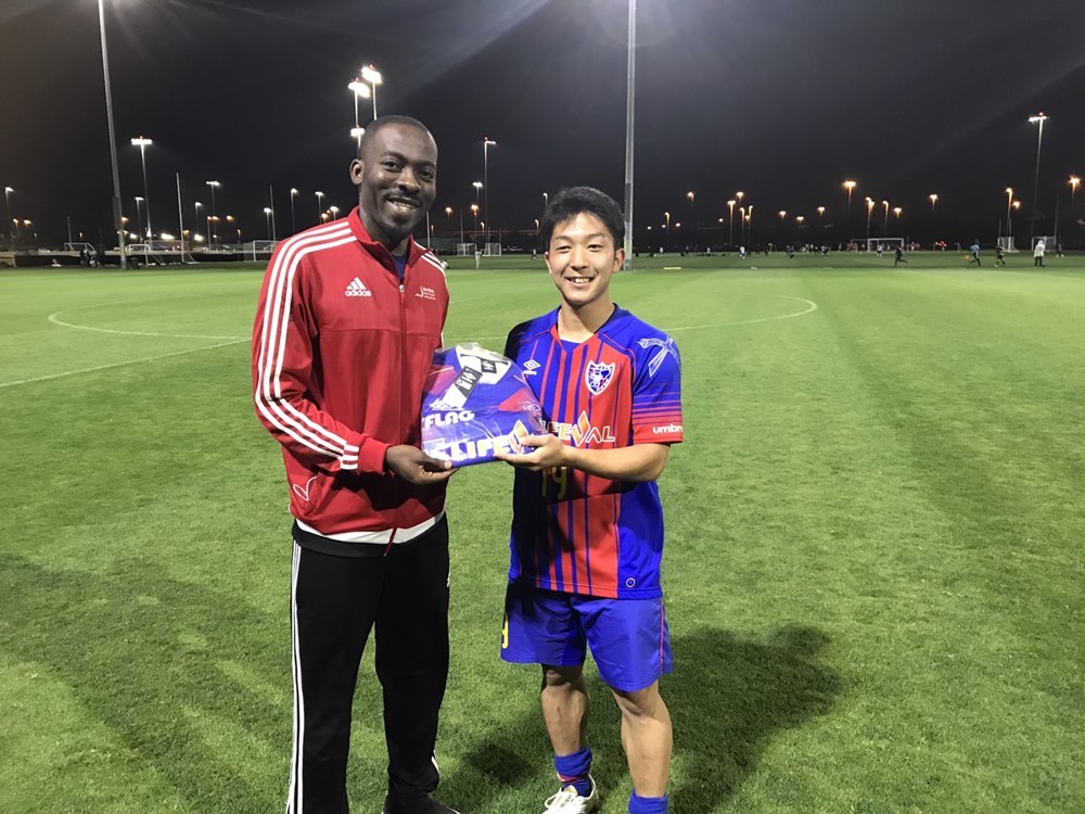 試合後にはお互いの健闘をたたえ合い、今回の遠征のキャプテン岡がシャーレをいただきました。谷地田は東京のレプリカユニフォームを贈呈し友好を深めました。