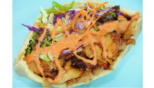 (5)ドネルケバブ・・・600円 世界三大料理のひとつ、トルコ料理を更にアレンジ!塩麹で漬け込んだ肉をジューシーに焼き上げます。ワンハンドフードの王道!ご堪能ください! |