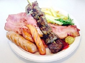 (7)絶品霜降りステーキ串コンボ・・・1,500円 霜降りステーキ串とベーコンとフランクフルトとポテトの盛り合わせプレートです。 |