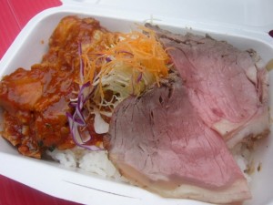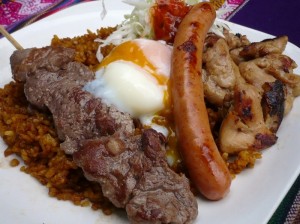 アメリカ南部のお米料理。ケイジャン風味のご飯にチョリソ、チキン、牛串がのった、ボリューム満点の1品です