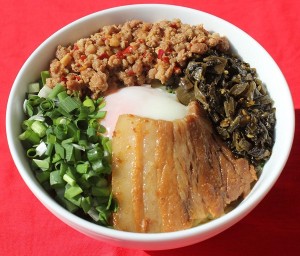 「自家製たれと麺の絡みが抜群!辛子と炒めた肉に卵、高菜、ニラをトッピング。豪快にかきまぜて食べると最高」 |