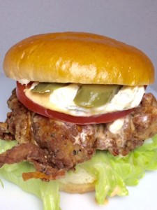 ハーブチキンバーガー・・・650円 国産の鶏肉を数種類のハーブで味付けし、カリッと揚げました。新鮮な野菜との相性がとても良いです。
