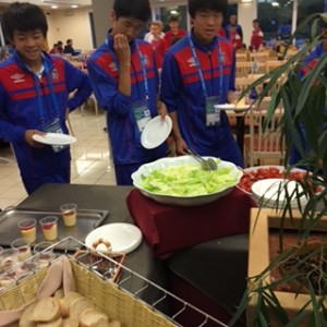 長いフライトですが機内では選手もリラックスしながら食事を楽しんだりしました。