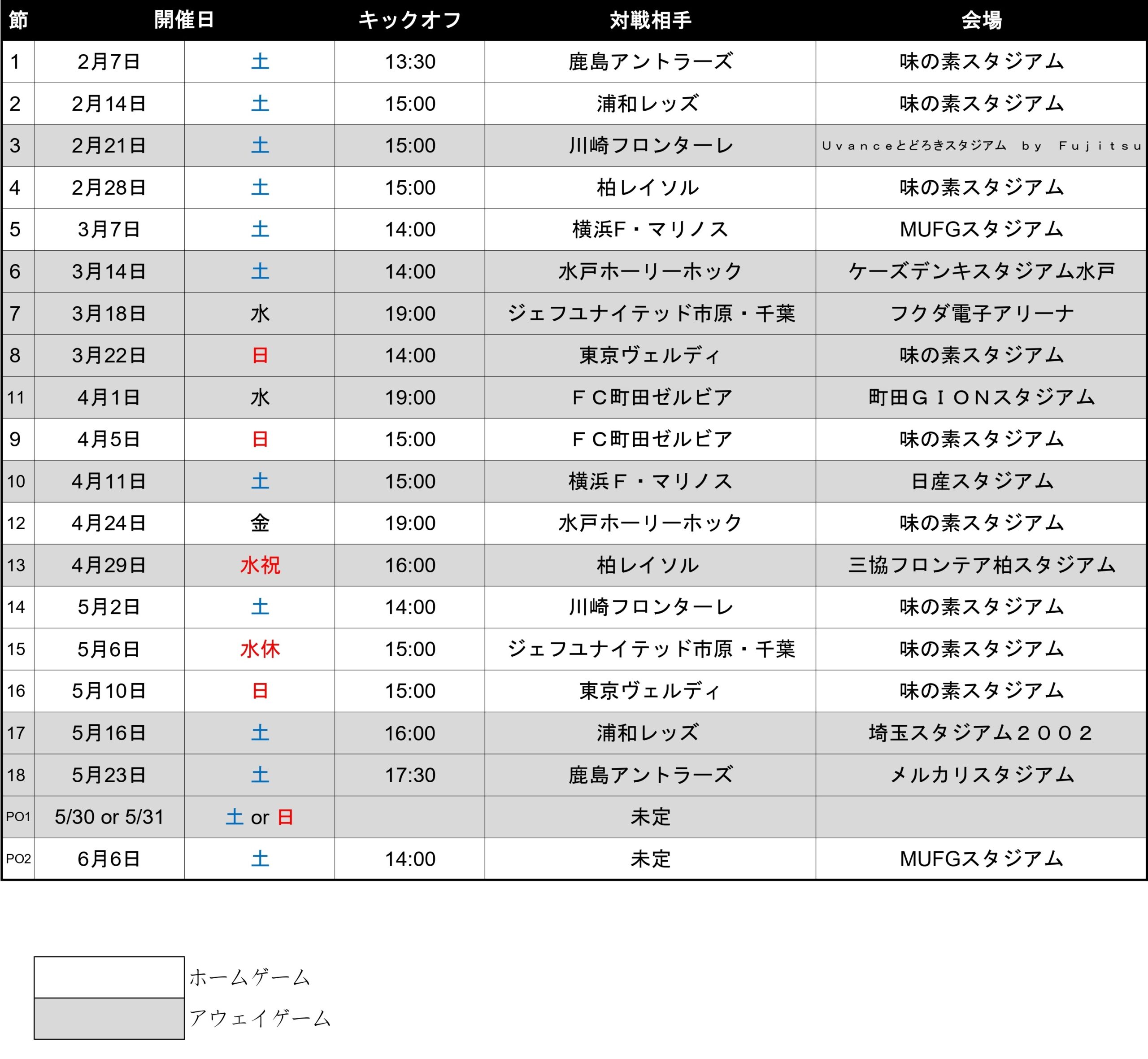 第1節、第2節の日程、キックオフ時間、スタジアムが決定しましたので、お知らせします。
