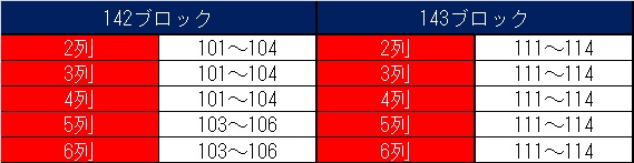 メインSSS指定席、メインSS指定席北側(1層目)、メインSS指定席南側(1層目)メインS指定席北側(1層目)、メインS指定席南側(1層目)、車椅子ホームメイン・バック自由席、車椅子ミックス自由席