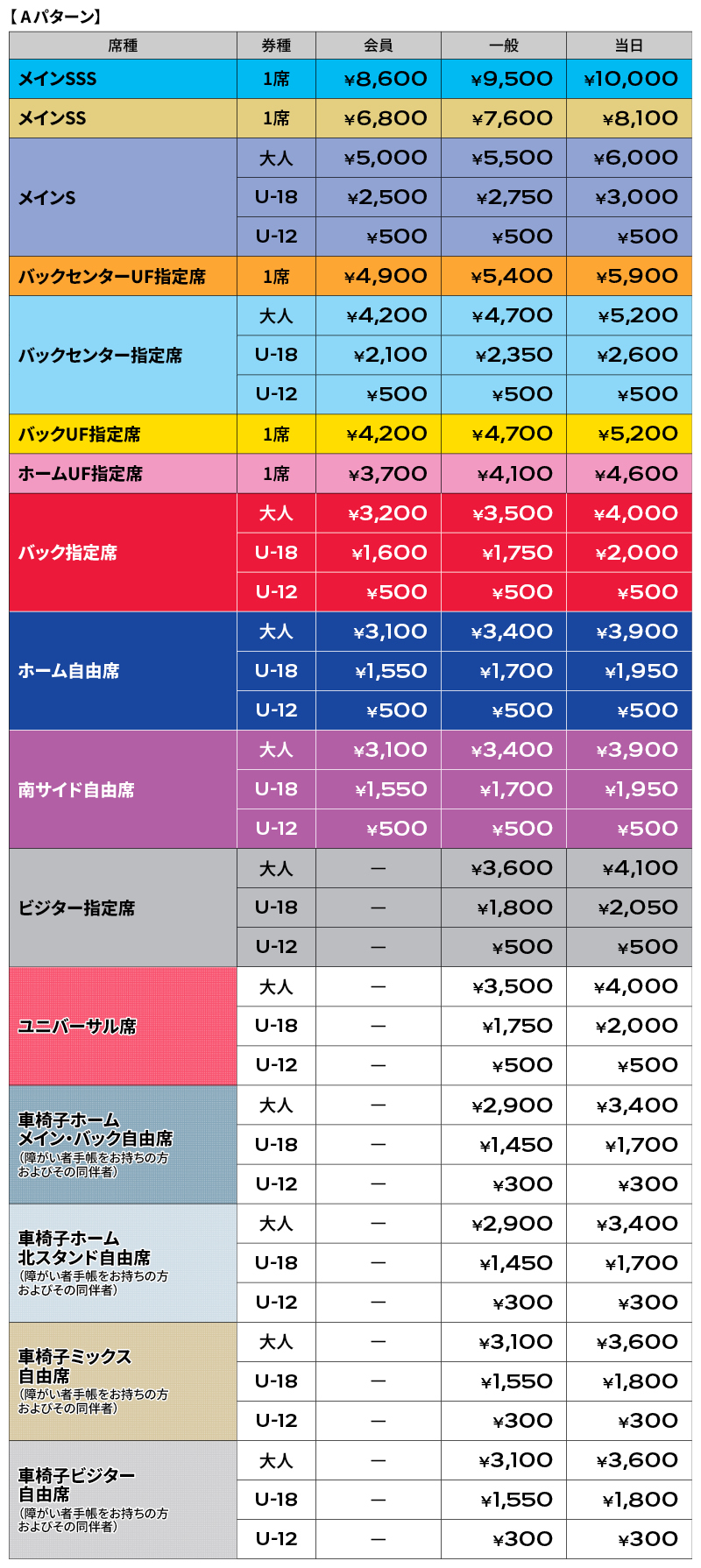 ※U-18料金は2008年4月2日生まれ以降の方、U-12料金は2014年4月2日生まれ以降の方が対象となります。未就学のお子様は保護者のお膝の上での観戦に限りチケットは必要ありません。