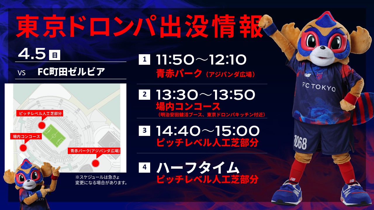 4月5日(日) 明治安田J1百年構想リーグ 第9節 vsFC町田ゼルビア(15:00キックオフ/味の素スタジアム)に東京ドロンパが下記のとおりあらわれます。