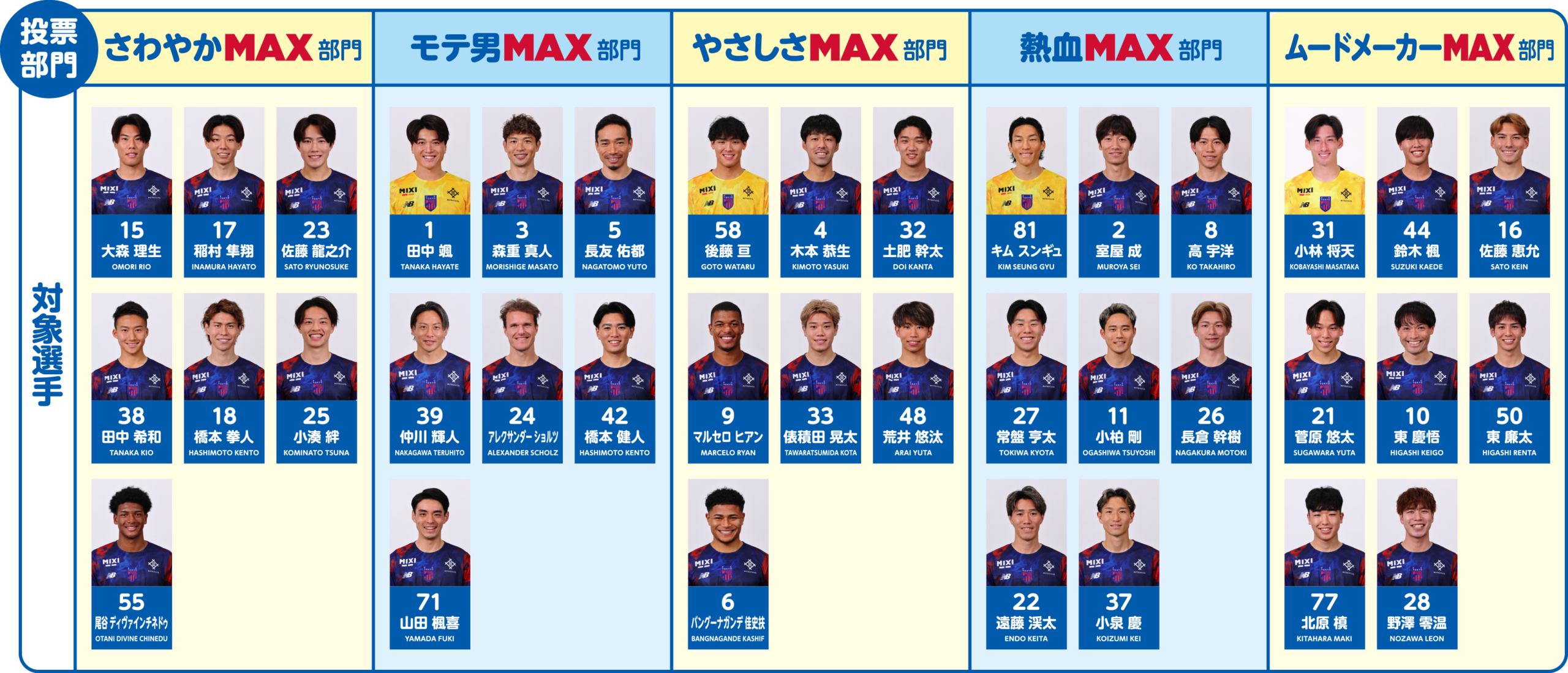 投票部門は、さわやかMAX/もて男MAX/やさしさMAX/熱血MAX/ムードメーカーMAXの5つ。