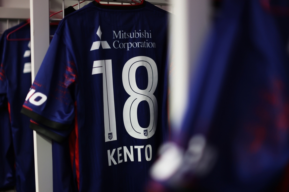 O uniforme azul e vermelho com o número 18 marcado estava pendurado no vestiário do Ajinomoto Stadium, esperando por Kento HASHIMOTO.