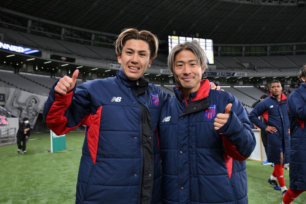 A, o jogador que eu realmente não quero perder para ele no Tóquio atual é o Kosuke SHIRAI. Mas, na verdade, somos muito bons amigos. Primeiro, fomos companheiros de quarto no acampamento de Okinawa quando participamos como jogadores designados especiais da JFA e da J-League. Foi aí que tudo começou, e desde então nos tornamos próximos, e agora nossos armários no centro de treinamento ficam lado a lado. Na última temporada, eu jogava como ponta e o Kosuke como lateral, então tivemos muitas oportunidades de formar uma relação vertical, e acho que conseguimos criar uma boa complementaridade. Por exemplo, muitas vezes eu disputava o tiro de meta e corria para cobrir a defesa. Como eu não tenho uma capacidade explosiva de drible, o Kosuke me ajudava fazendo sobreposição nessas situações. Acho que essa ajuda mútua dentro de campo criou uma boa relação entre nós. Naturalmente, nossas conversas aumentaram e também passamos a sair para comer juntos com mais frequência. Nesta temporada, pela segunda vez consecutiva, fomos companheiros de quarto no acampamento de Okinawa, e durante o período de folga, fomos juntos a uma ilha remota. Bem, o Kosuke se transferiu no verão da temporada 2023, e como ele tinha poucos conhecidos e amigos, achei que estava difícil para ele se adaptar, então eu só estou acompanhando ele, sabe? (risos).