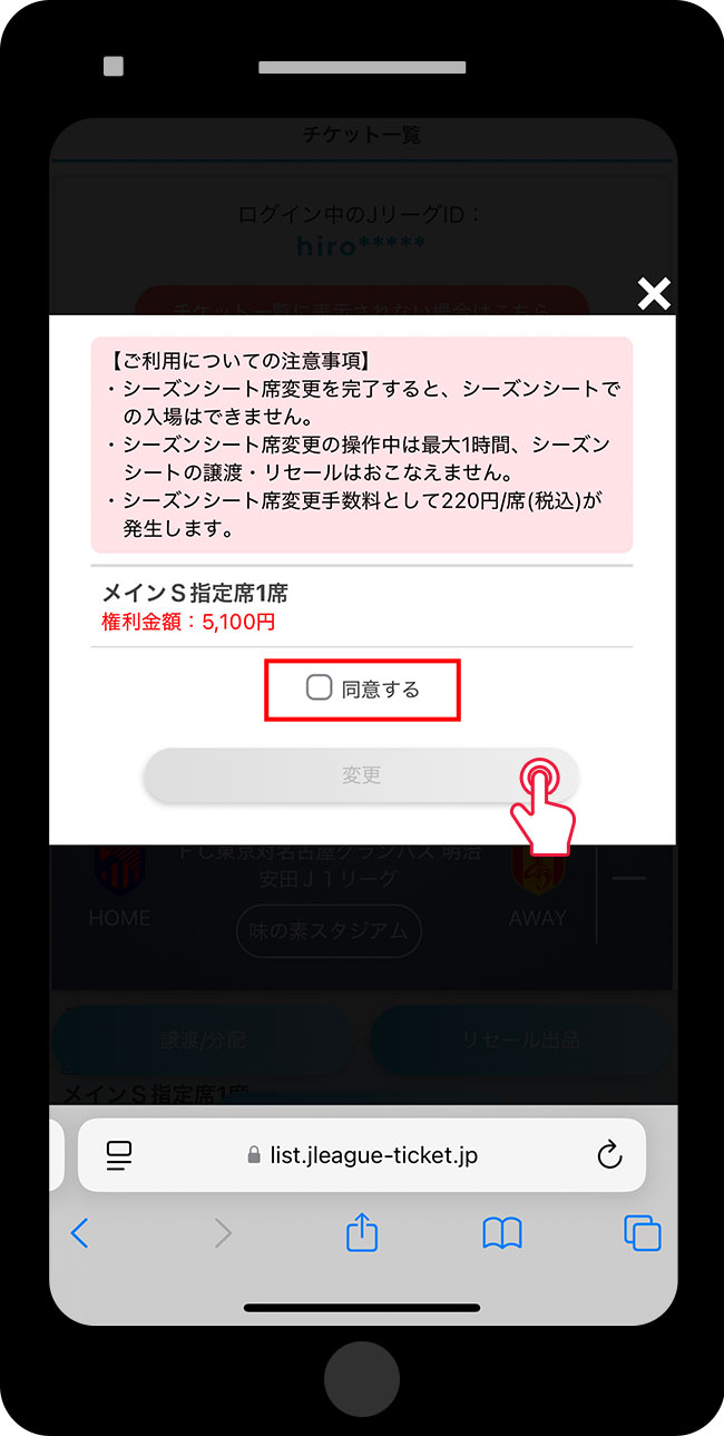 * "Alteração de assentos da temporada em andamento" será exibida na parte superior.