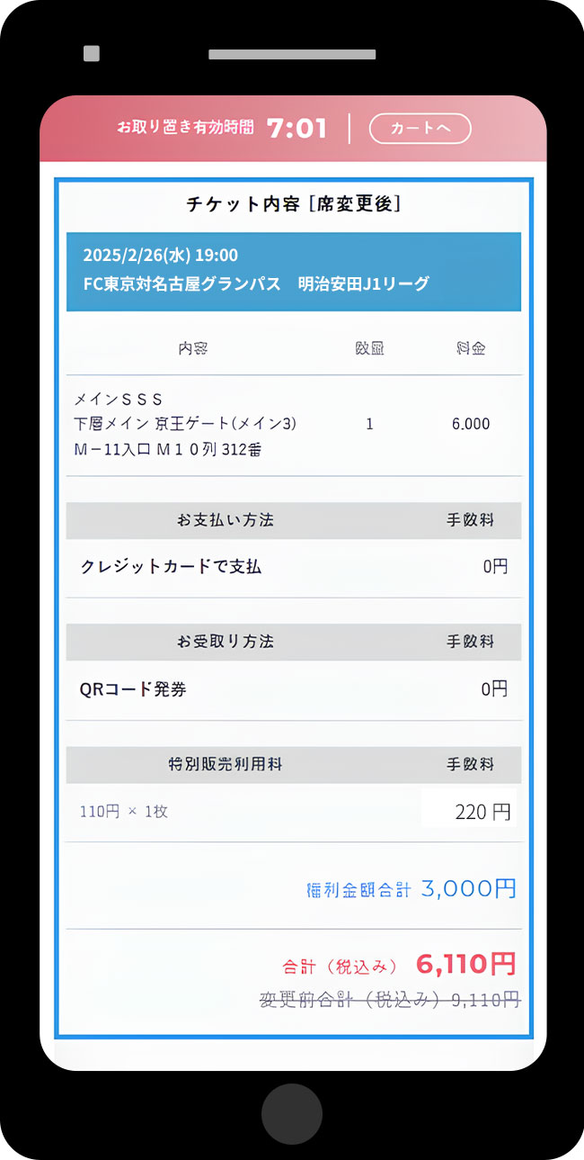 - O pagamento da taxa do ingresso ao alterar o assento reservado será "o valor do assento após a alteração" menos "o valor pago no momento da reserva inicial do assento". Ao alterar um assento reservado utilizando um cupom de desconto para ingressos de benefício de associação ou um ingresso de convite válido para todos os tipos de ingresso, o valor pago no momento da reserva inicial não inclui o valor do desconto, portanto, o valor do desconto não será deduzido do valor do assento após a alteração. Por favor, fique atento a isso.