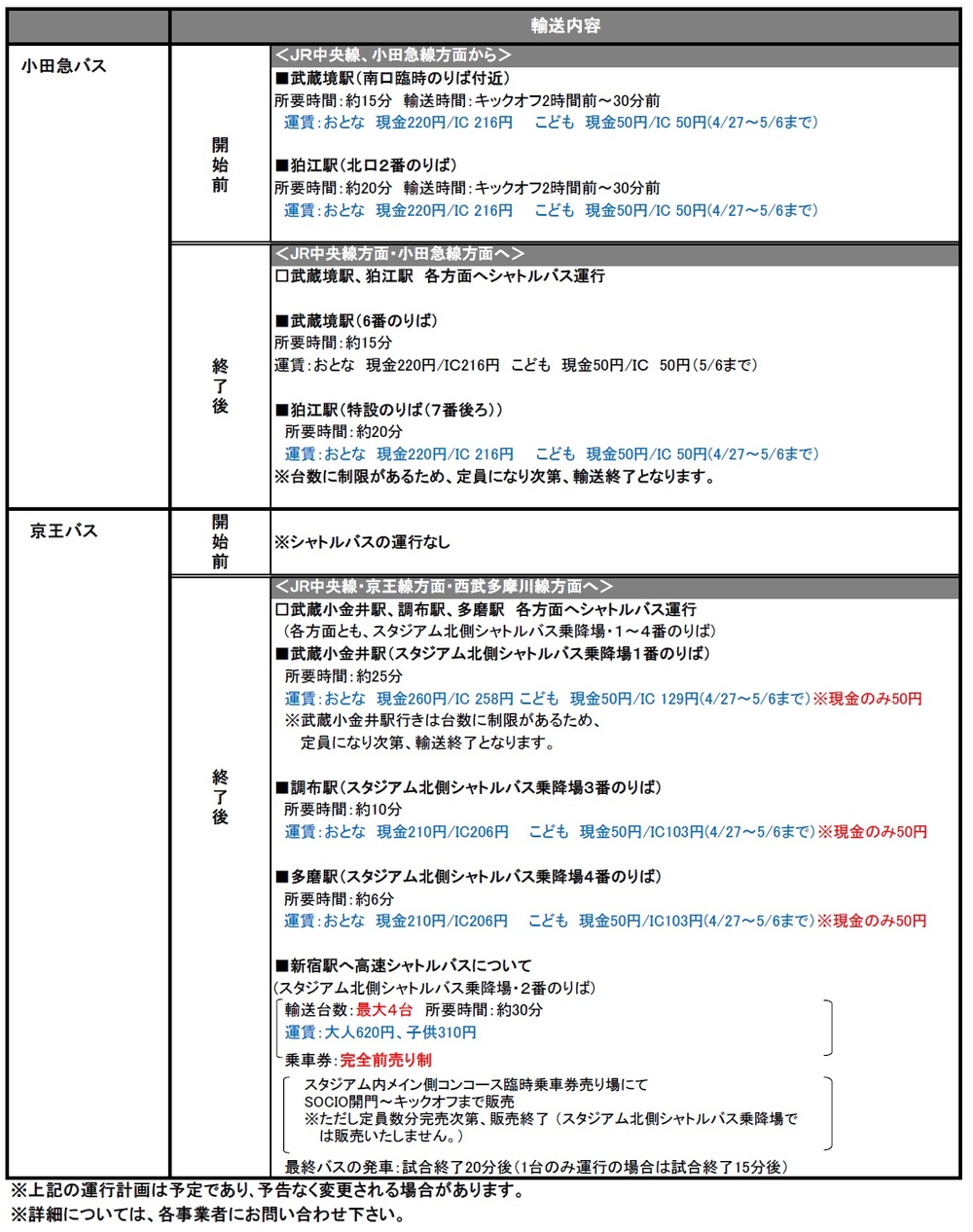 ※Aviso sobre a mudança do ponto de ônibus direto do Ônibus Odakyu para a saída sul da Estação Musashisakai no Ajinomoto Stadium