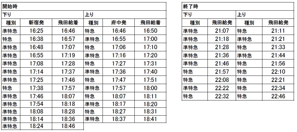 Sentido descente… 13 trens expressos e semi-expressos das 16:25 às 18:24 partindo de Shinjuku
