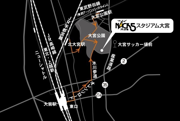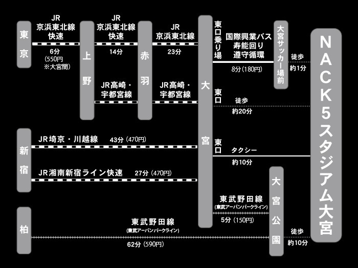 ・Da saída leste da estação JR "Ōmiya", pegue o ônibus da Kokusai Kogyo com destino ao "Dōshu Junkan" e desça no ponto "Ōmiya Soccer Field-mae", cerca de 1 minuto a pé