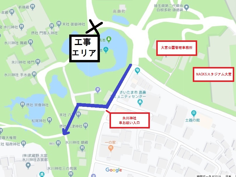 Além disso, solicitamos que todos que se dirigem para a estação Ōmiya após o término da partida utilizem a rota que passa ao lado do Escritório de Administração do Parque Ōmiya e atravessem o terreno do Santuário Hikawa pela entrada de bênção de veículos do Santuário Hikawa.