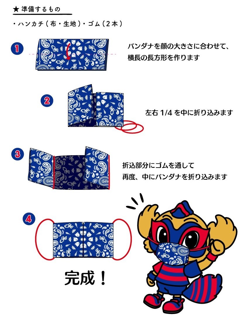 O FC Tokyo está vendendo "bandanas" e "máscaras de tecido" que podem ser lavadas e reutilizadas como medidas contra a dispersão de gotículas.