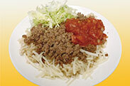 Carne moída, queijo e salsa sobre o arroz. Um prato muito popular.