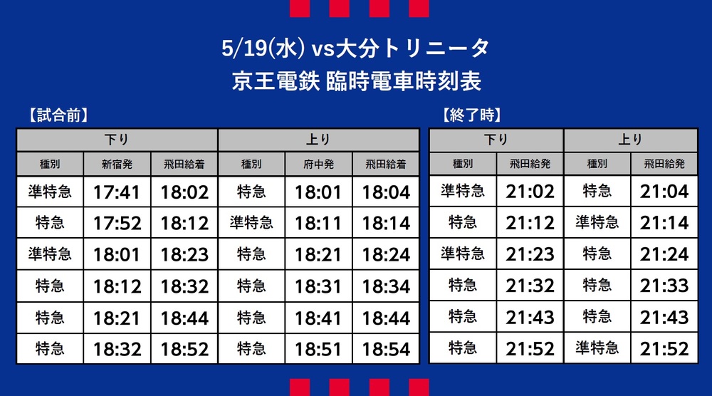 19 de maio (Qua) Acesso temporário ao transporte (ferroviário) para o jogo da 6ª rodada da fase de grupos da Copa YBC Levain da J-League 2021 vs Oita Trinita (kickoff às 19:00 / Ajinomoto Stadium).
